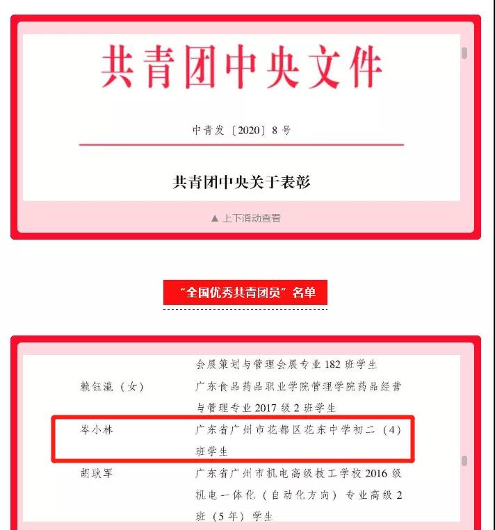據悉,「全國優秀共青團員」是共青團中央授予優秀團員的最高榮譽,本次表彰中,全國範圍內僅505名青年獲此殊榮。岑小林,曾就讀花都區花東鎮七星小學,現為花東中學初三年級學生,2018年4月加入中國共產主義青年團。曾獲「最美南粵少年」、「廣東省優秀共青團員」等榮譽稱號。