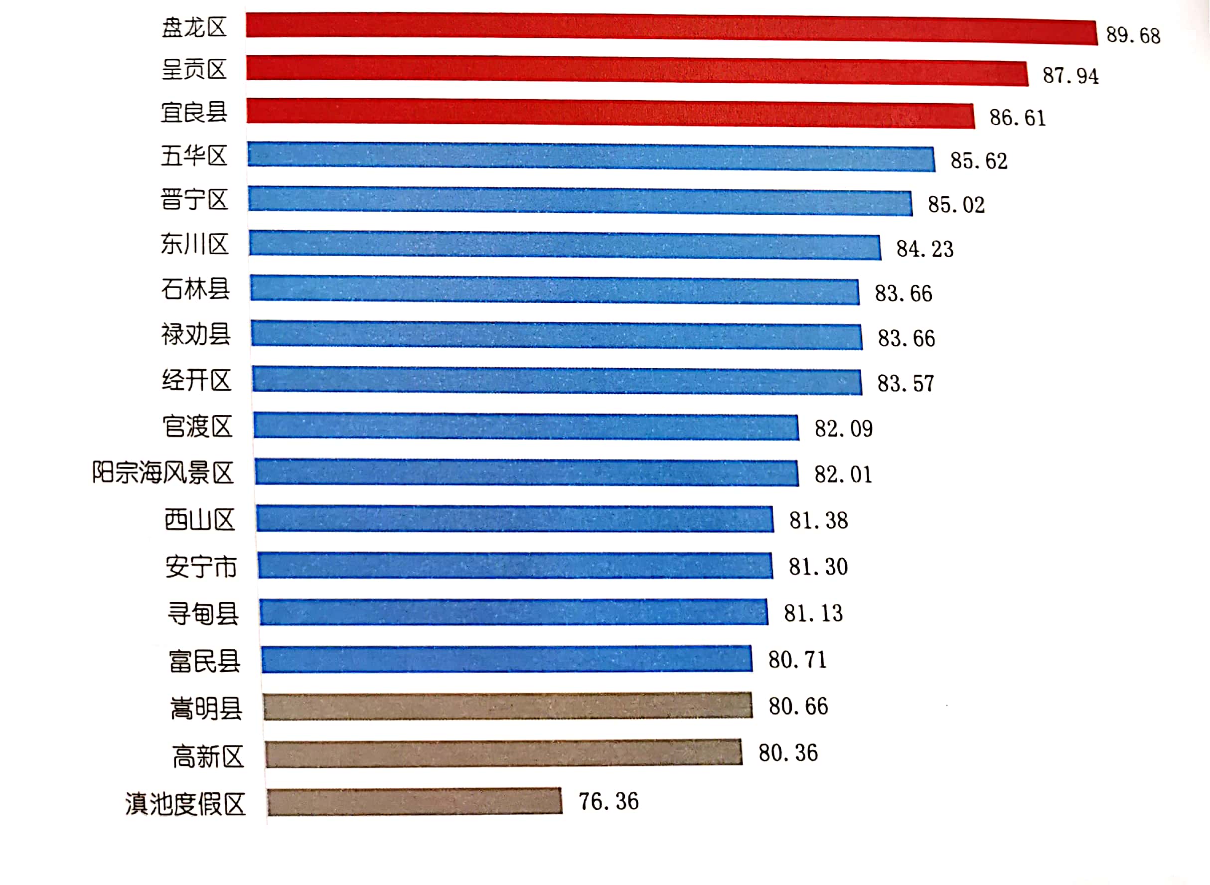 同時,在18個縣區中,盤龍區(89.68分)、呈貢區(87.94分)、宜良縣(86.61分)綜合得分排名前三,進入紅榜;嵩明縣(80.66分)、高新區(80.36分)、滇池度假區(76.36分)綜合得分排名後三,進入黑榜。
