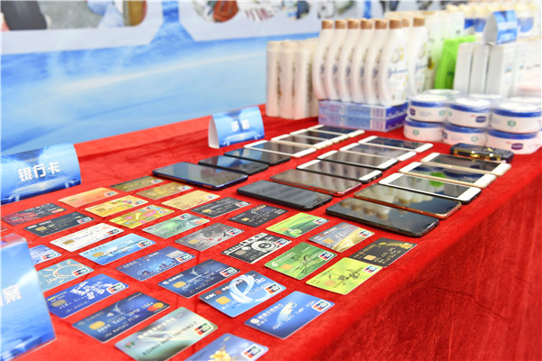 2019年5月31日,在廣東省公安機關「颶風2019」專項行動新聞發佈會現場,公安民警展示涉案物品(攝影:王正)