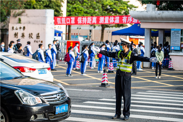 2020年4月27日,梅州公安民警在校區護航復學復課(攝影:何志林)