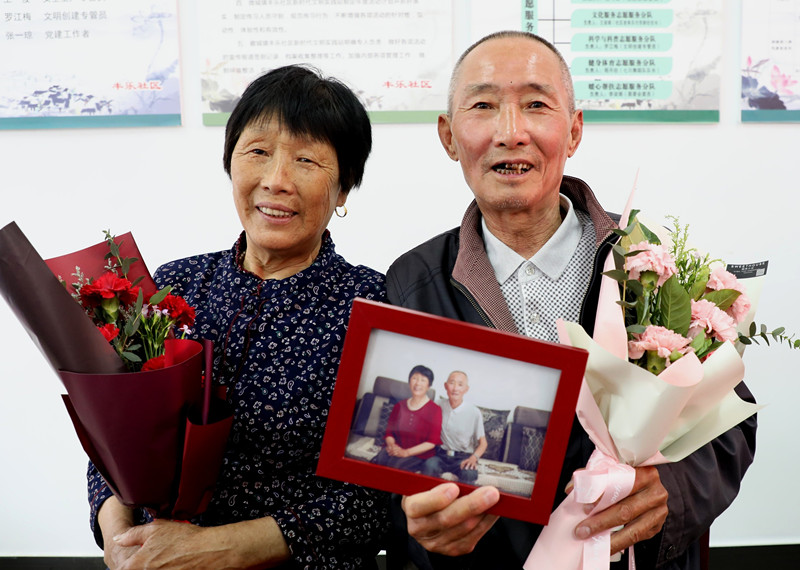 5月9日,安徽黃山市歙縣婦聯在徽城鎮七川社區舉辦 “情濃五月天,感恩母親節”系列活動, 73歲張德凎與71歲妻子張月娣在展示婦聯拍攝並贈送的金婚照。