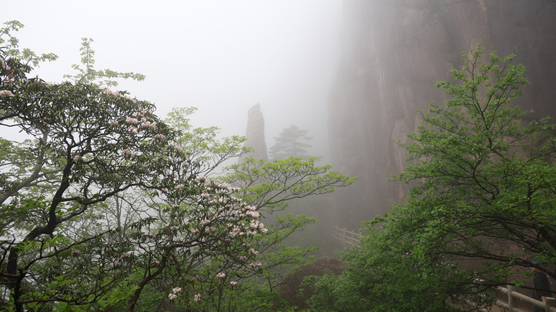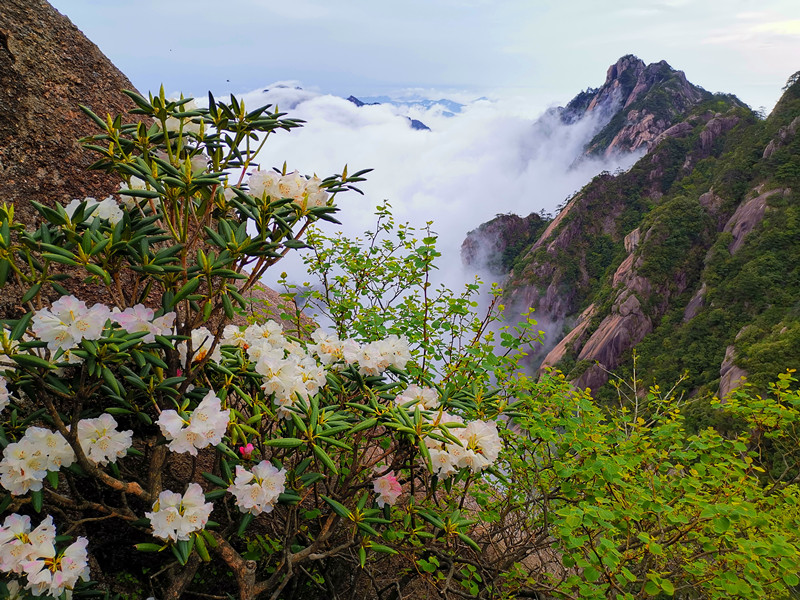 值得一提的是,和別處賞花不同,黃山杜鵑生長海拔較高,因此當雨後天晴,雲海顯現,杜鵑花的粉白和流雲瀑布般的雲海和諧地融為一體,映襯著遠處壯麗雄奇的巍峨大山和蒼健挺拔的青松,如詩如畫,讓人忍不住駐足拍照留戀。