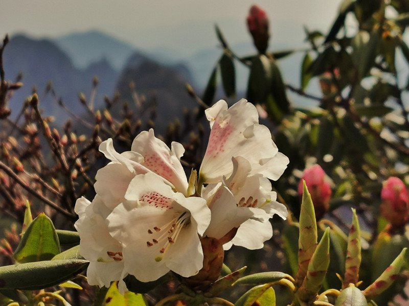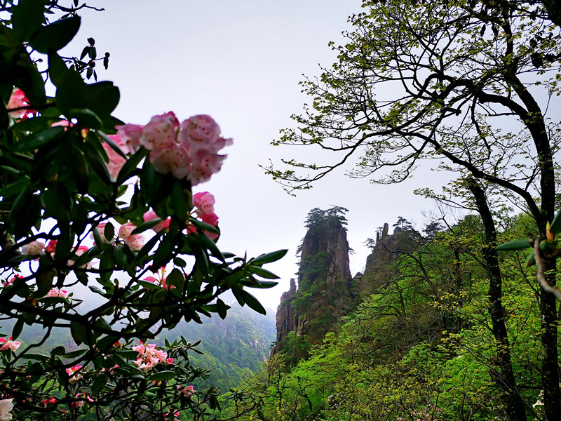 黃山杜鵑小貼士:黃山杜鵑又名安徽杜鵑,杜鵑科杜鵑屬,常綠灌木。安徽省省花。為我國特有的珍貴稀有樹種之一。花期4至5月,果實8至9月。海拔1350米以上的玉屏樓、北海、西海、散花塢、信峰等地均有較大面積分佈。入春以後,山下的木蘭,山上的杜鵑基本上相繼開花。故古詩有“山中可名為二花,木蘭杜鵑並相誇。四月同時爭開放,深紅淺白鬥雲霞”。(吳敏 趙美君 徐翌)