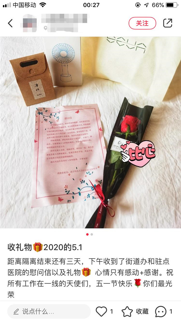 收到街道節日禮物的隔離人員,在小紅書發言感謝