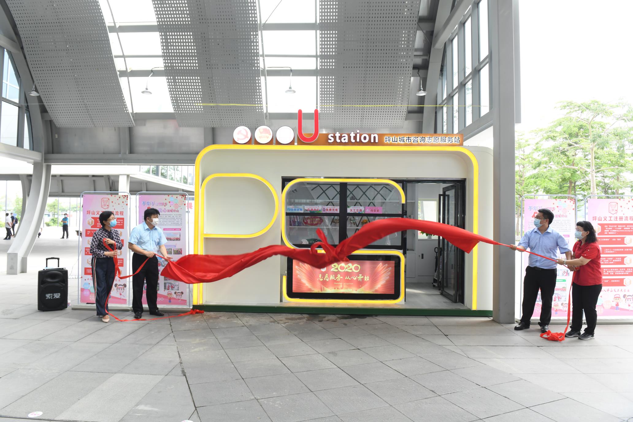 【香港商報網訊】記者 焦家志 報導:5月12日,深圳坪山高鐵站城市諮詢志願服務U站正式揭幕成立。深圳團市委志願者部負責人杜欣,坪山區委副書記李映中等領導出席揭幕儀式。區委組織部、區委宣傳部(文明辦),區群團工作部、區交通軌道管理中心以及各街道團工委、坪山高鐵站派出所、廈深鐵路坪山站等相關部門主要領導及義工代表共50餘人參加了活動。