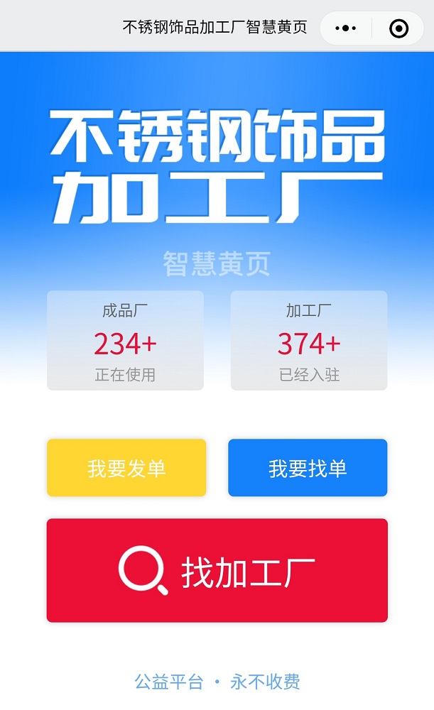 面對疫情衝擊,海外訂單取消或延期,企業內銷猶如進入盲區及行業協作存在壁壘,生存壓力不小。為整合不鏽鋼飾品行業資源,促進加工廠與成品企業之間的緊密聯繫,加快行業轉型升級,一伴飾品生態園聯合長安電子協會共同打造了不鏽鋼飾品行業專屬線上平台——不鏽鋼飾品加工廠智慧黃頁。