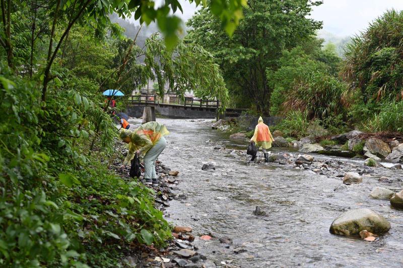 夜來驟雨蕩輕塵,益護新安入鶴城。一路青山帶雲雨,野溪流水碧悠悠。竹籬石板傍溪斜,手握鉗夾過人家。循死角,過流灘,起落之間,點撿垃圾、都尋遍,個個盈手滿。
