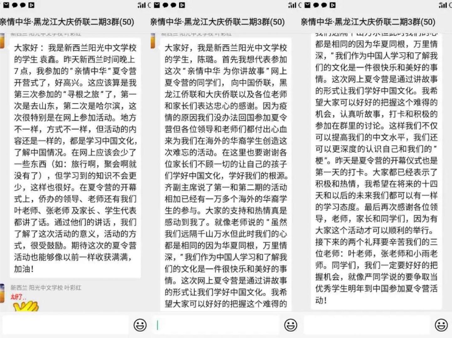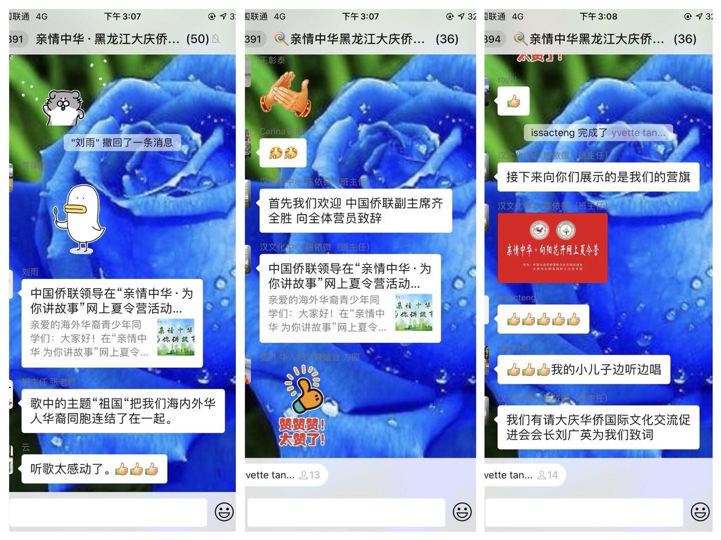 在黑龍江大慶「向陽花開」網上夏令營10個微信群里,各國領隊、老師、營員、家長代表紛紛在線上發表致辭和感言,氣氛熱烈,萬里一家親的深情濃烈而感人。