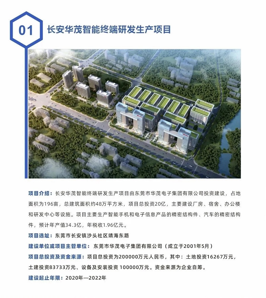 其中,長安華茂智能終端研發生產項目由東莞市華茂電子集團有限公司投資建設,佔地面積為196畝,總建築面積約48萬平方米,項目總投資20億,主要建設廠房、宿舍、辦公樓和研發中心等設施。項目主要生產智能手機和電子信息產品的精密結構件、汽車的精密結構件,預計年產值34.3億元,年稅收1.96億元。建設起止年限從2020年—2022年。