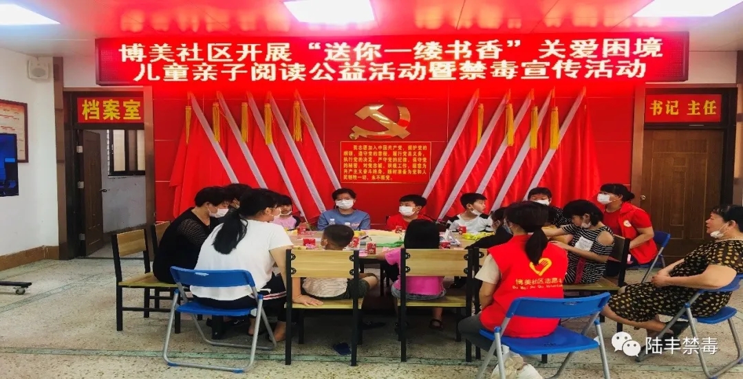 5月16日上午,博美鎮婦聯在博美社區開展以「送你一縷書香」關愛睏境兒童為主題的親子閱讀活動,觀看「看見幸福『閱』出夢想」直播節目。定期開展家長兒童樂於參與、便與參與的家庭教育講座、親子閱讀輔導等活動、提高家庭教育水平,豐富兒童精神文化生活。以通俗易懂的語言為小朋友講解了毒品的種類,剖析涉毒的危害及如何識毒、防毒、拒毒等相關法律知識。
