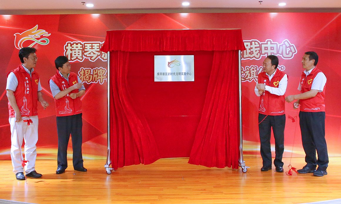 橫琴新區黨委書記牛敬、區紀委書記羅亦寧、管委會副主任吳創偉、市委宣傳部調研員邱育才共同為橫琴新區新時代文明實踐中心揭牌,橫琴新區新時代文明實踐志願服務總隊長牛敬為志願服務支隊授旗。