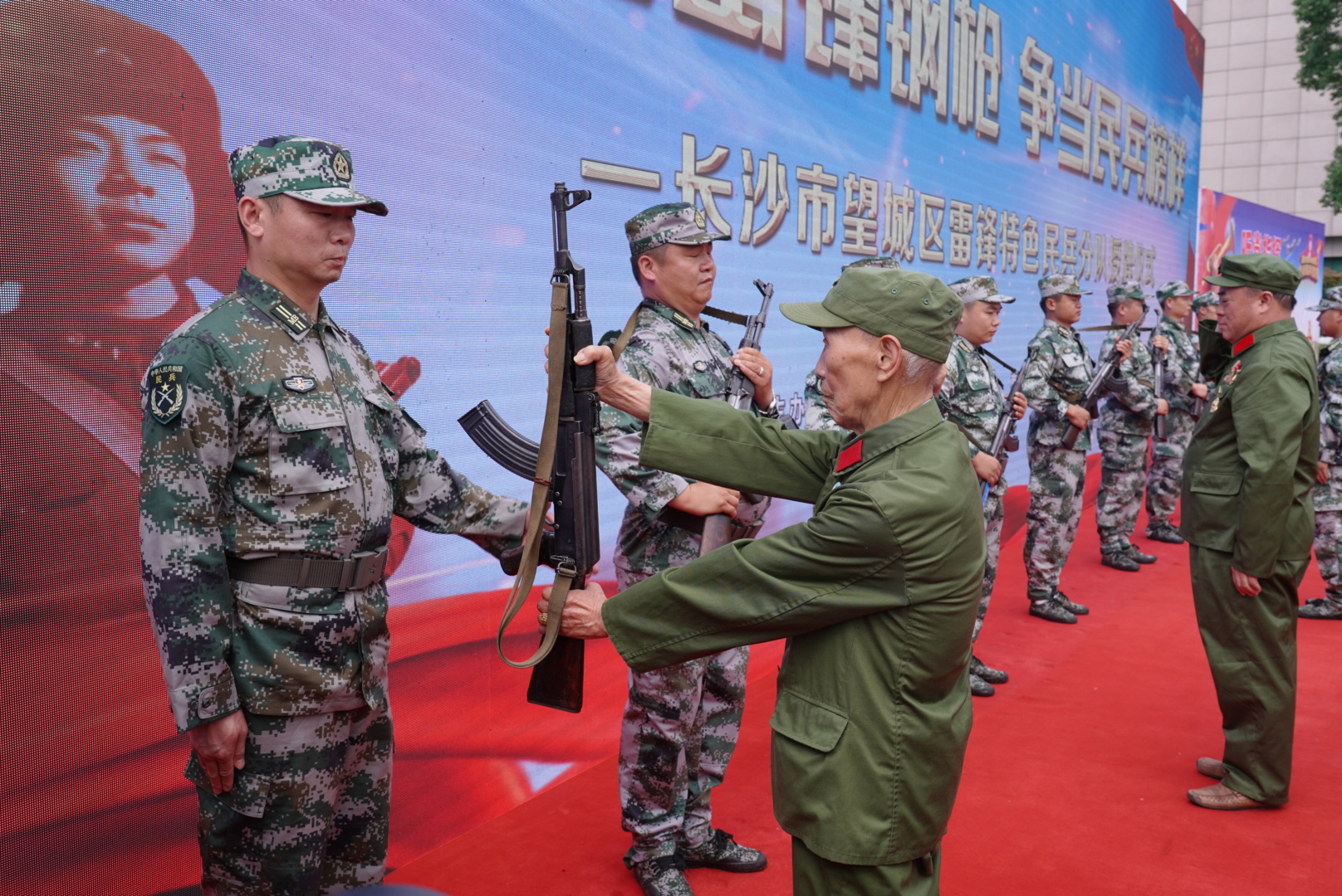 「接過雷鋒的槍/雷鋒是我們的好榜樣/接過雷鋒的槍/千萬個雷鋒在成長……」伴隨着雄壯的《接過雷鋒的槍》革命歌曲,曾參加過抗美援朝87歲高齡的老兵譚桂輝,曾在保衛祖國南疆戰役中受傷、榮立三等戰功、退役後全身心撲在國防教育事業上的老兵陳光輝,曾在抗洪搶險中因毒蛇咬傷、昏迷一天一夜的「雷鋒之星」陽志國,曾幫扶退伍殘疾軍人就業、熱心公益事業的學雷鋒先鋒吳卓等5名不同時期的學雷鋒典型代表身着戎裝走上舞台,把手中的鋼槍傳遞給新入隊的民兵代表。