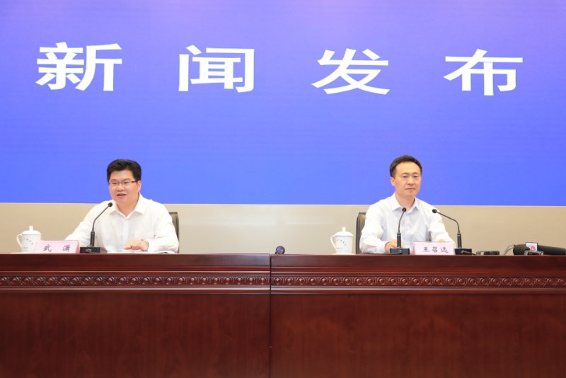安徽省貫徹落實中央「六穩」「六保」部署要求系列新聞發佈會(第六場),安徽省委宣傳部新聞發佈處處長武瀟(左)主持發佈會,省財政廳副廳長王召遠介紹相關情況並答記者問(孫軍/攝)