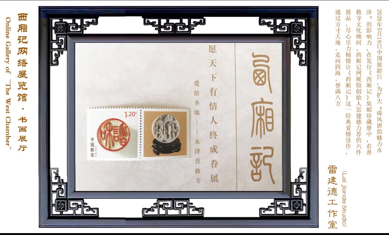 雷建德工作室“西廂記網絡展覽館”一組六件展品,曾以中法兩種文字入選《法國郵票印象——中國殿堂級藝術家篇章》,讓富有中國特色的西廂文化登上了法國郵票,此次也同樣有六件展品特別選入中國郵票,系從雷建德搜集的當代珍貴展品中擇優而選。