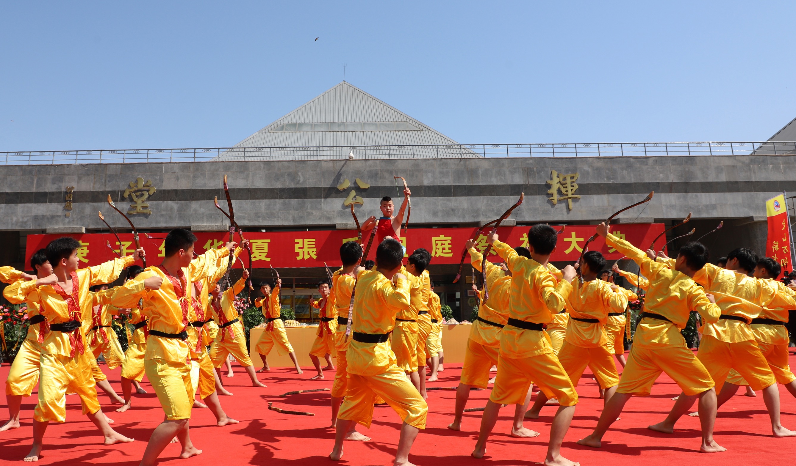 在隆隆的戰鼓聲中,一名宗親手托神弓,四名宗親護衛其後,將象徵著「弓矢漁獵拓土開疆、華夏安富黎民頌揚」的神弓請上祭壇。清河張氏宗親聯誼會會長張印居三開神弓,代表全體張氏後裔,祈佑風調雨順、疫情早退、張氏興旺。由36名少年表演的《長弓舞》,通過橫空出世、天下一統、再創輝煌三個部分,頌揚了揮公發明弓矢、造福後人的曠世功勳,將祭祖大典推向高潮。