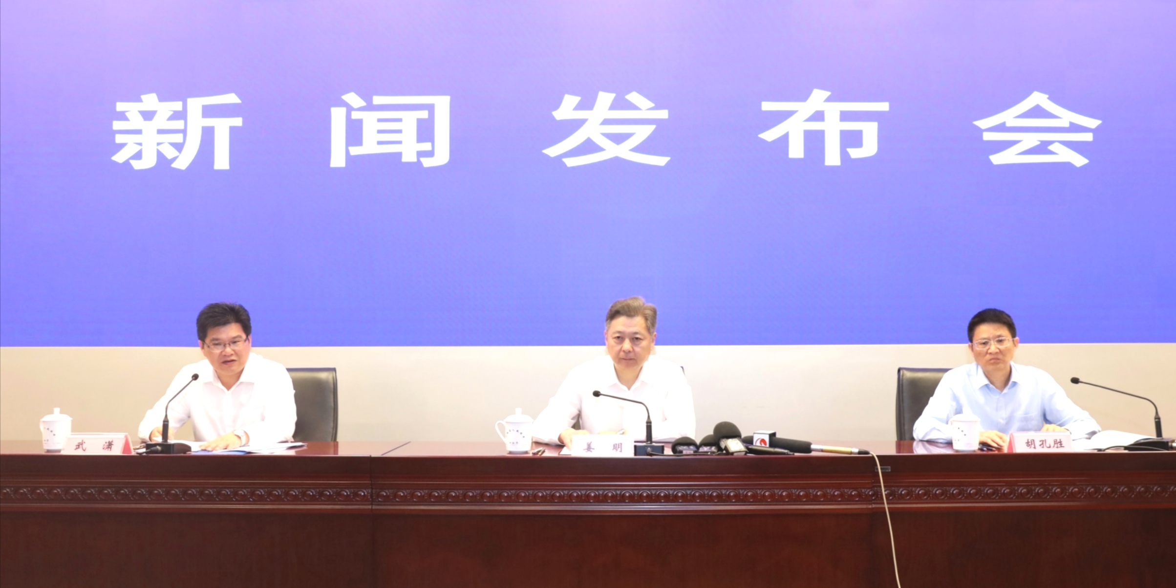 安徽省律師行業改革發展情況新聞發佈會現場,左起:安徽省委宣傳部新聞發佈處處長武瀟主持發佈會,省司法廳黨委書記、廳長姜明,副廳長胡孔勝先後介紹有關情況,並回答記者提問(孫軍/攝)