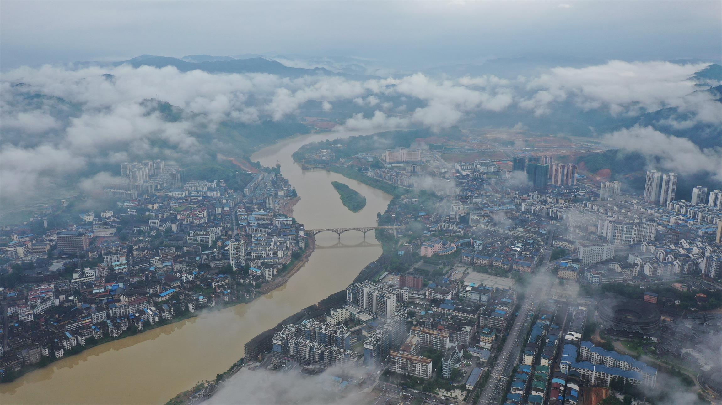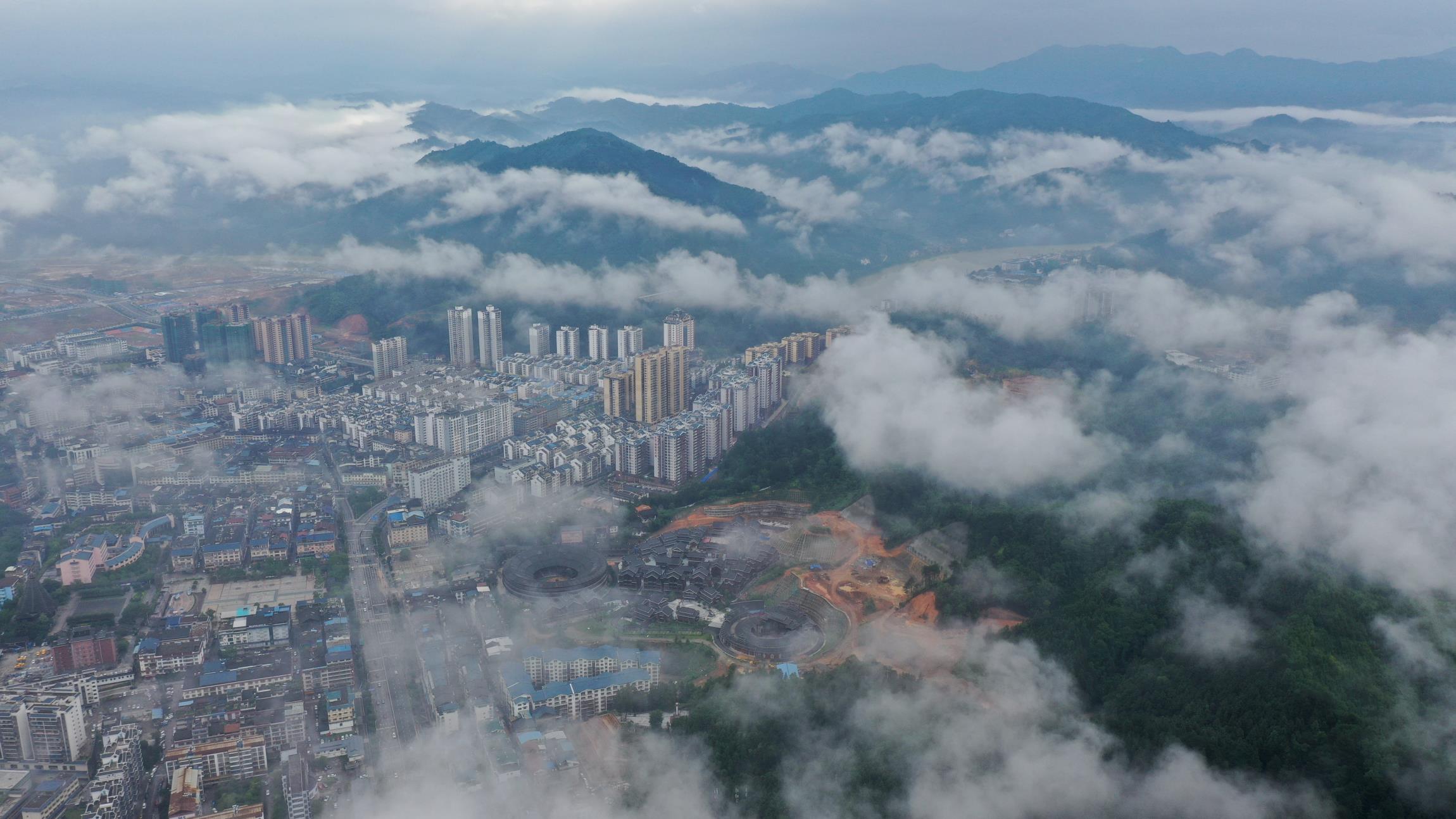 6月2日,無人機鏡頭下的廣西柳州市三江侗族自治縣縣城雲霧繚繞,宛若仙境。當天,三江縣城出現平流霧景象,縣城上空雲霧瀰漫,與城裡的風雨橋、鼓樓、鳥巢等特色建築相互映襯,美不勝收。