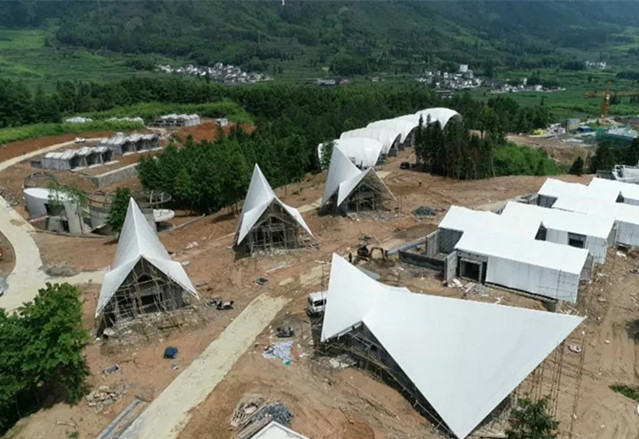 該项目總投資17億元,規劃面積2300畝,包括關麓古村落區、野奢帳篷度假區、生態度假康養區等五個板塊,著力將项目打造成集養生、休閒、文化體驗為一體的特色小鎮。其中帳篷客房投資1.4億元,是最先破土動工的,共有17個單體建築,74間客房,將於今年10月份試營業。
