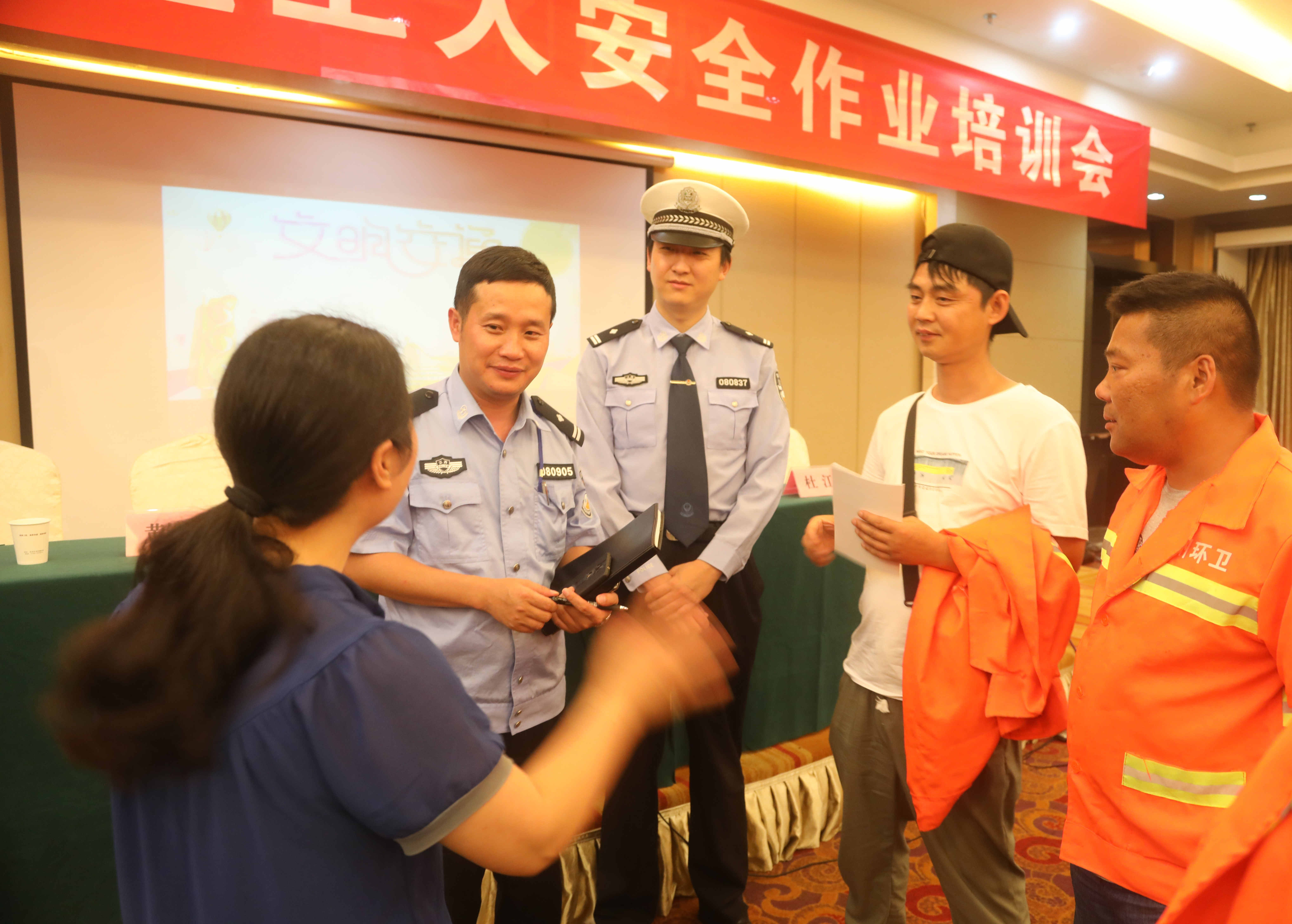課程結束後,授課民警們走下講台與環衛工人們進行交流互動,通過現場提問等形式幫他們進一步強化安全教育知識並一再強調環衛工人在工作中要注意「工作安全、交通安全、身體安全」。