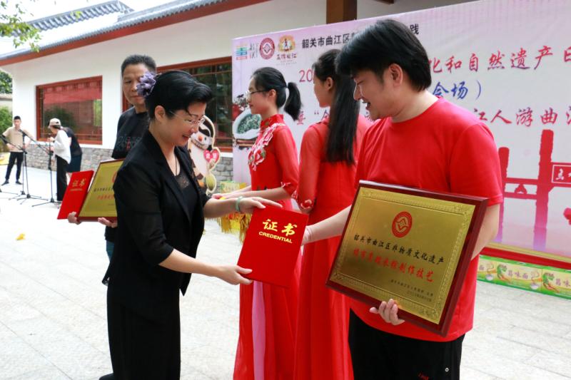 今年全國「文化和自然遺產日」的主題是:文物賦彩全面小康,結合主題,韶關市曲江區分會場開展了內容豐富、精彩紛呈的活動。活動現場,首先為曲江區第八批非物質文化遺產項目傳統技藝沙溪粉、傳統技藝樟市黑糯米粽、傳統技藝雞仔壩黃氏鹿膠熬制技藝、傳統體育曲江馬家槍等4個項目及其傳承人頒發牌匾和證書,對曲江區在挖掘保護非遺文化上作出的系列工作表示認可。