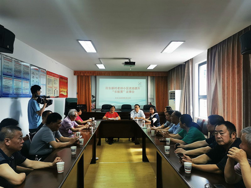 在社區的三樓會議室,一場關於老舊社區改造提升的“長板凳”議事會正在進行,社區內不少黨員、網格長、居民都參與進來,提出自己的意見建議。