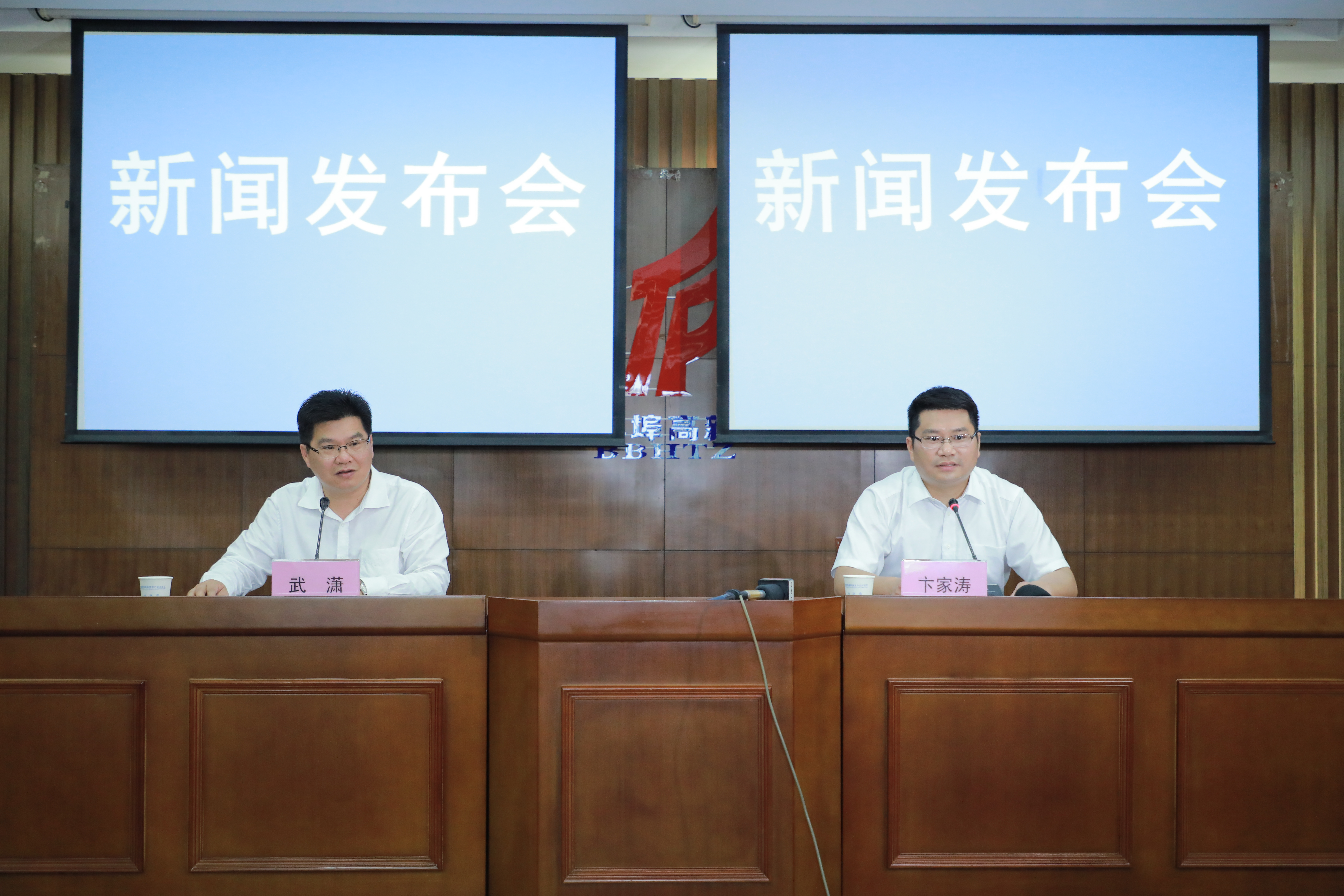 由安徽省委宣傳部舉辦的「走進安徽國家級開發區」新聞發佈暨集中採訪活動走進蚌埠高新區。左起:安徽省委宣傳部新聞發佈處處長武瀟主持新聞發佈會,蚌埠高新區黨工委委員、管委會副主任卞家濤介紹有關情況並回答記者提問(許夢宇/攝)