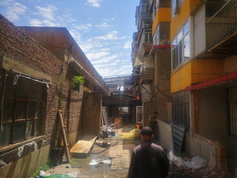 康新街13號居民樓部分一層為一家企業所有。該企業在發展進程中,為了增加產能和擴大就業,在樓體周圍先後搭建起廠房。該企業自收到限期拆除公告後,積極響應並堅決支持拆違工作;企業負責人多次給員工做思想工作,穩定人心。要求企業員工充分認清政府對拆違工作的決心和力度,做到積極配合,服從拆違工作人員的步驟安排,舍小家顧大局,不做不利於拆違的事,堅決不拖後腿。在組織員工將違建房屋內的物品和設備搬出後,又組織員工自己動手拆除違建。