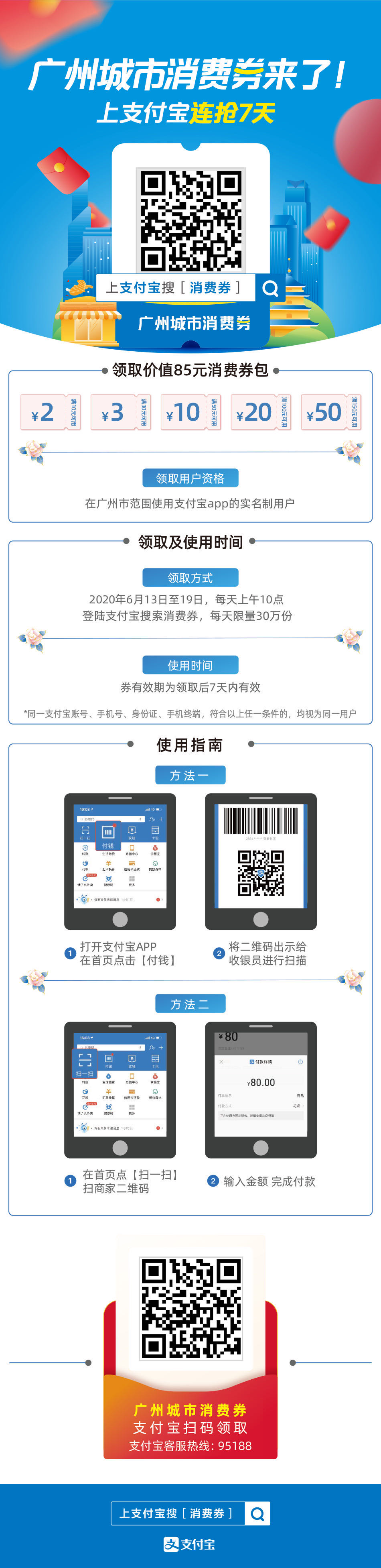 【香港商報網訊】支付寶積極響應廣州市商務局全城聯動促進消費復蘇的號召,在市商務局的指導下,將聯合廣州近千商家發放1050萬張總價值為1.78億元的消費券。6月13日至19日每天上午10點,市民可在支付寶搜索「消費券」,一鍵領取價值85元的消費券禮包,每天限量30萬份。廣州市內的居民(包括來廣州旅遊的人士)都可以領取消費券,先到先得。價值85元的消費禮包券包括1張滿10立減2元消費券,1張滿30立減3元消費券,1張滿50立減10元消費券,1張滿100立減20元消費券,及1張滿150立減50元消費券。所有參與商家門店均可使用滿10立減2元消費券。