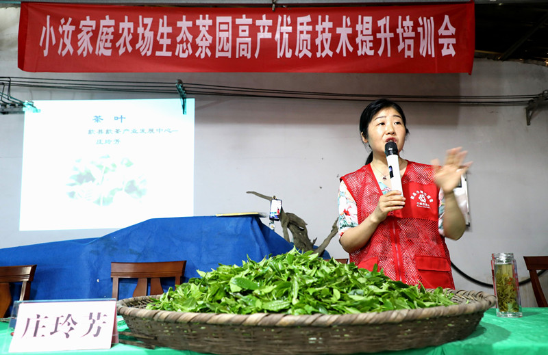 【香港商報網訊】6月12日,安徽歙縣溪頭鎮桃源村小汝家庭農場舉辦生態茶園高產優質技術提升培訓會,縣歙茶產業發展中心農藝師、巾幗科技“特派員”莊玲芳(中)給百名茶農和貧困婦女講授夏茶管理技術和科技助脫貧的方法。