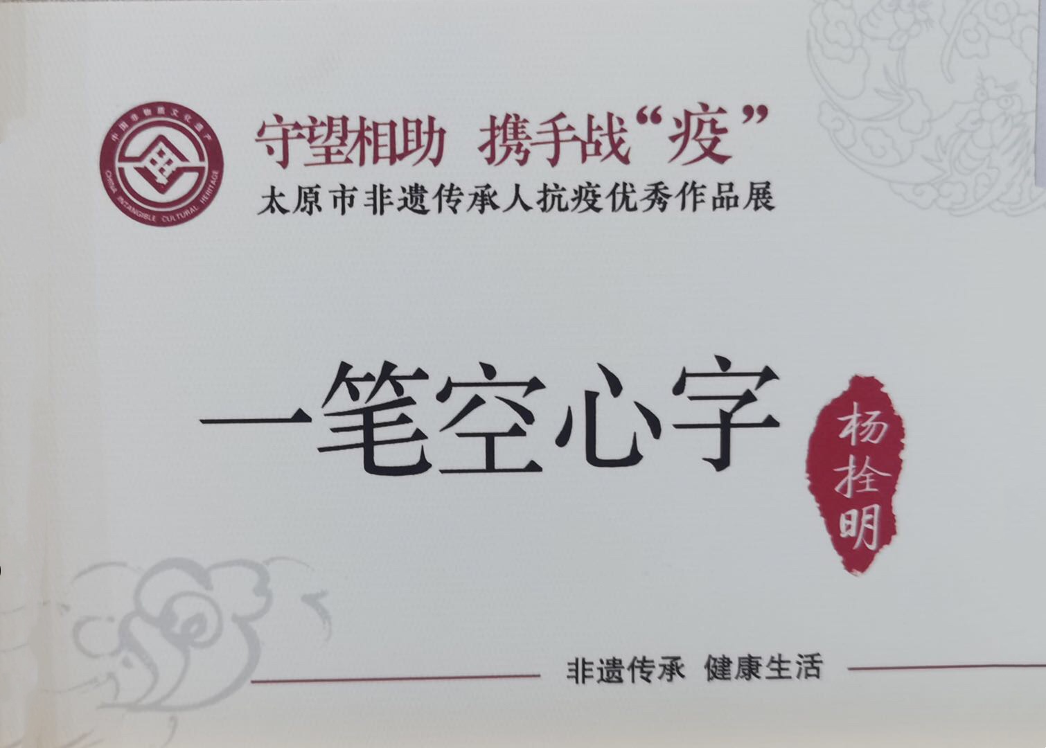 太原市非物質文化遺產保護中心主任張建明稱,楊拴明創作的一筆空心字抗疫作品形式新穎、章法有度。將抗疫之情、之感、之意用自創的組合空心字一筆勾勒,既遵循了漢字及書法創作的字法、筆法、墨法,又充分融入、添加了創作者的設計理念以及真情實感,實屬難得。