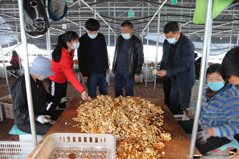 在支部聯合上,13個村黨支部、1個合作社黨支部、1個企業黨支部,三類黨支部同頻共振,聯合組建了長春鎮食用菌產業黨委,幫建共商破解發展難題,合力推進扶貧產業基地深入發展。合作社將現有154棟大棚入股鑫鑫菌業,生產加工滑子菇,目前已進場菌包90萬袋。在干群聯動方面,長春鎮選派75名優秀黨員幹部作為聯絡員,每名聯絡員負責組織8—9戶貧困戶到基地務工,目前已組織貧困戶671戶1247人。
