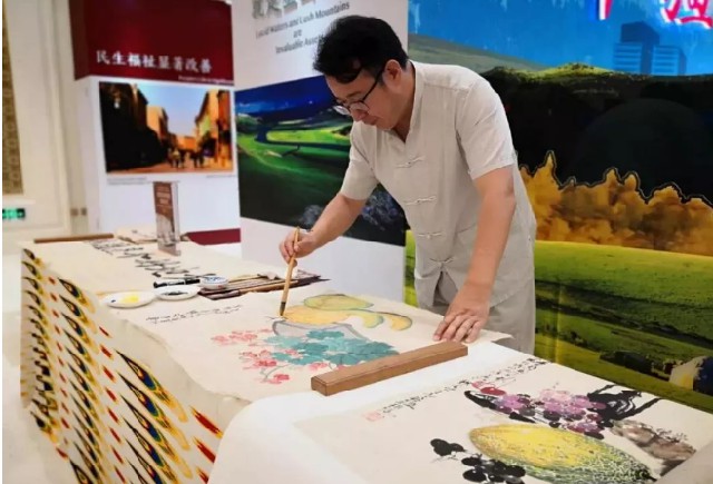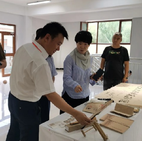 新疆國畫院展出的桑皮紙文創產品吸引遊客觀看