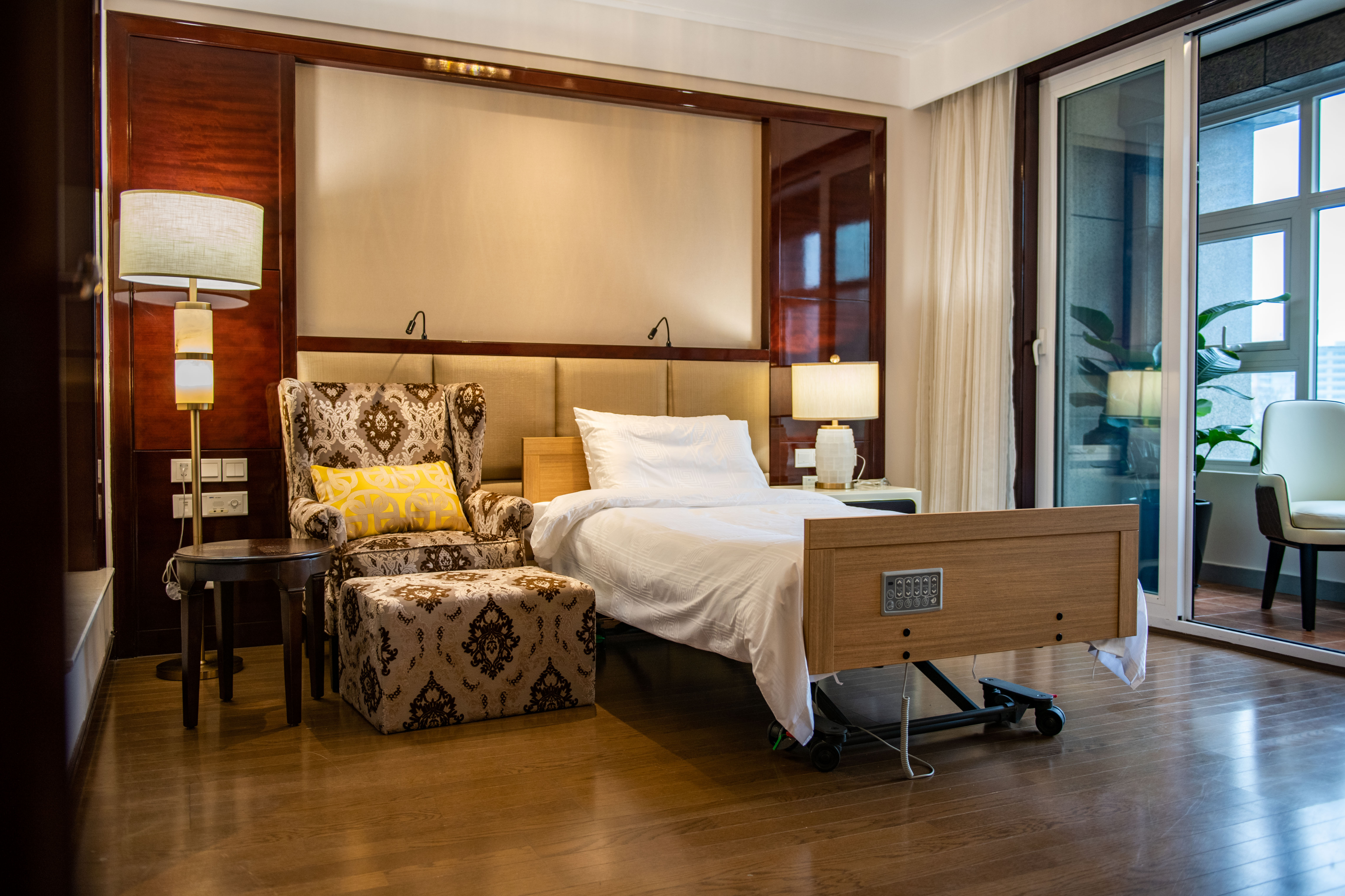 在房型上,莫朗公館也有單間、套房多種戶型可供選擇。擁有大玻璃窗的「園景房」內,配有高端電動床、防燙淋浴開關等適老設施。單間的居住氛圍不僅能夠充分地保證入住老人的隱私,也有套房能夠滿足夫妻或者兄弟姐妹「組團入住」。