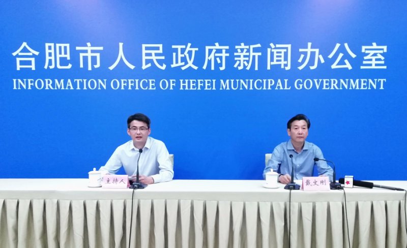「走進產業園區 探尋產業地標」合肥系列新聞發佈會現場(第八場),合肥市委宣傳部外宣辦主任趙明錄(左)主持發佈會,安巢經開區黨工委委員、管委會副主任戴文剛介紹相關情況(孫軍/攝)