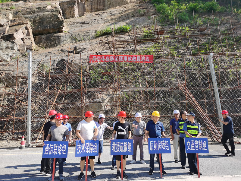 應急演練以在建项目G330(X041、S322)線公路專項養護工程(災害防治)施工現場5號點B區施工過程中發生岩層崩塌為演練背景。隨著安全員監測預警,演練拉開序幕,應急隊伍接到報告後立即組織各應急小組到達了現場,封鎖現場,拉好警戒線,疏散無關人員,調集機械設備進入施工現場,對塌方及時進行清理保證路面暢通。同時技術保障組安排人員對腳手架進行全面檢查,並對塌方進行調查,分析原因。演練中以監測預警、情況速報與應急回應、應急調查、應急處置,對突發高空墜物搶險措施進行了全景式展現。