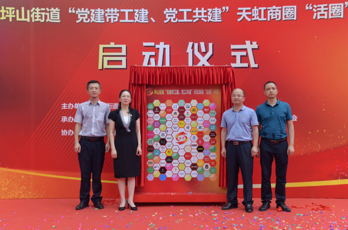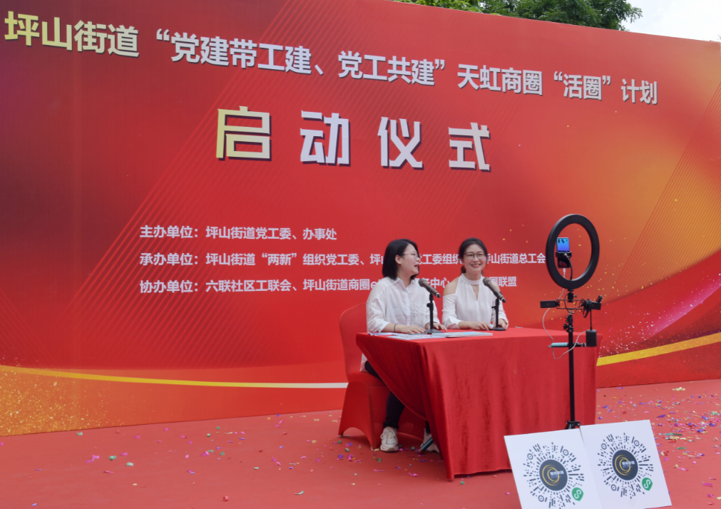 直播開始前,坪山街道舉行了「黨建帶工建,黨工共建」天虹商圈「活圈」計劃啟動儀式。坪山區委組織部、區總工會、坪山街道相關領導及坪山街道商圈e家黨群服務中心黨組織、紅色商圈聯盟、街道下轄企業職工代表出席了揭牌儀式。