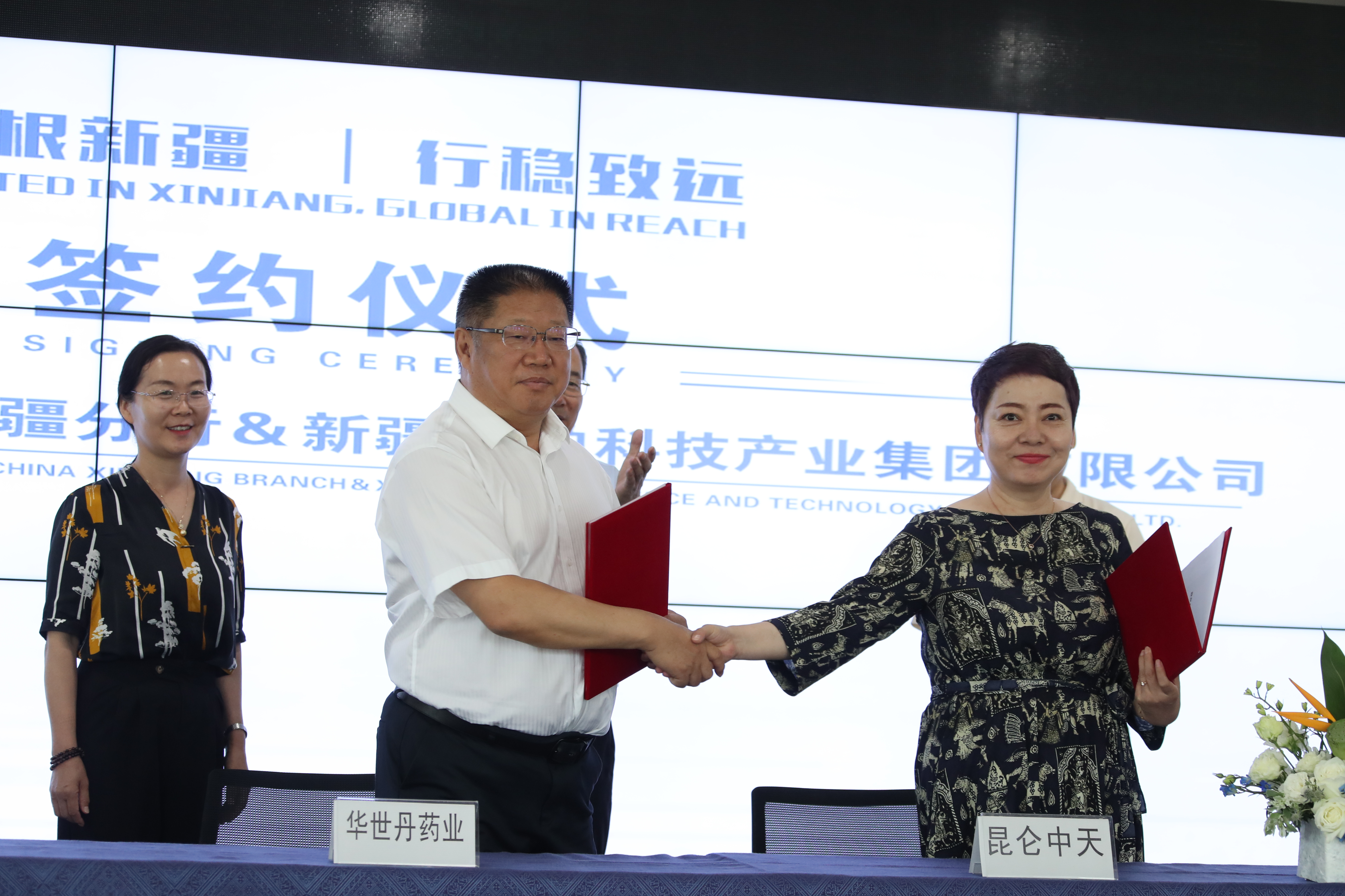 自治區藥品工業協會名譽會長、新疆華世丹藥業股份有限公司黨委書記、董事長武嘉林(左)與新疆崑崙中天股份投資管理有限公司總經理程小蘭簽署股權合作框架協議