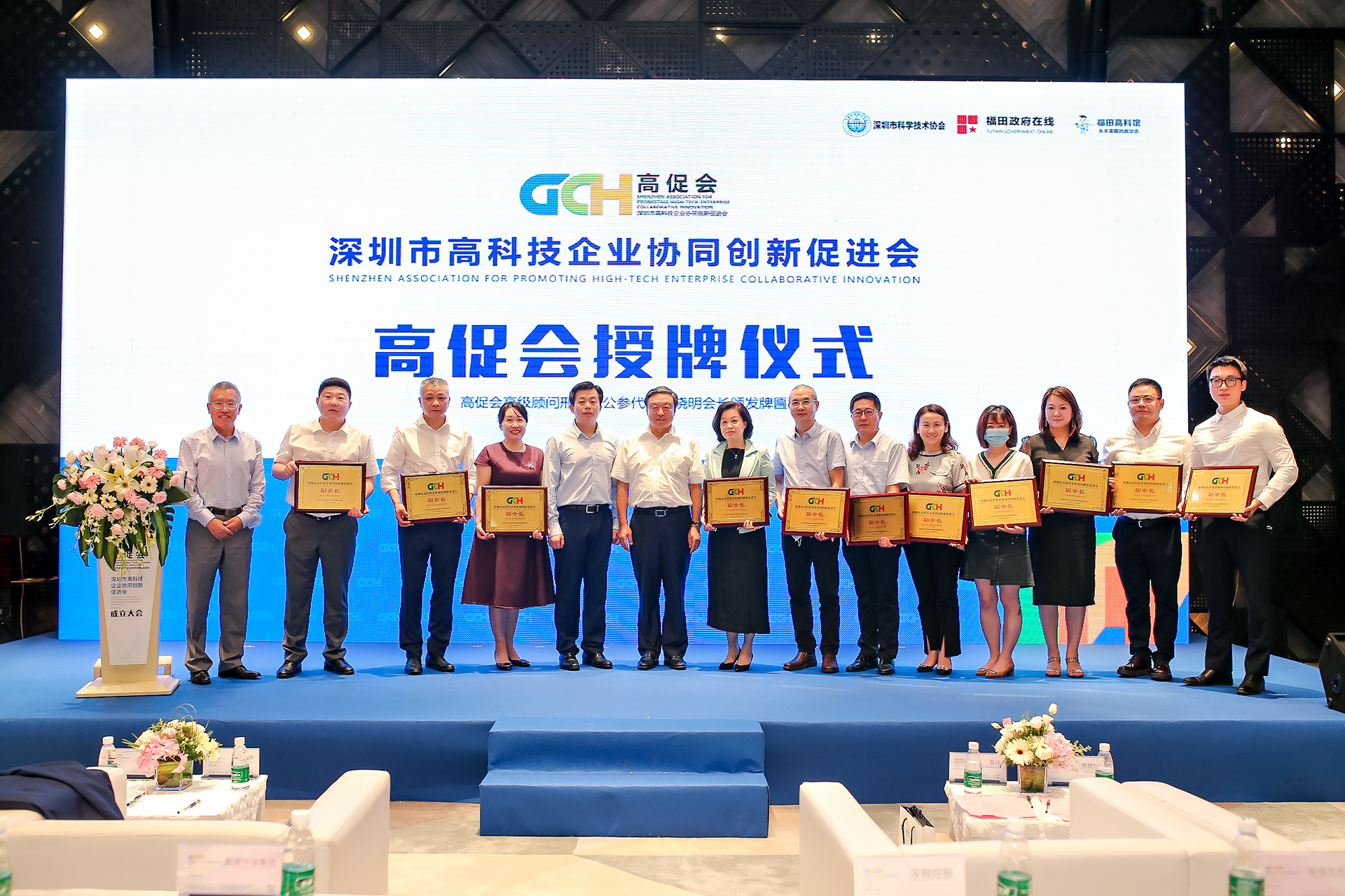 深圳市福田區區長黃偉,深圳市委統戰部常務副部長范坤,深圳市科學技術協會黨組書記、副主席林祥,高促會高級顧問、前中國駐紐約總領館公使參贊邢繼俊,深圳高促會榮譽會長馬蔚華,福田區科技創新局局長張忠暉,深圳市南山區科協常務副主席殷明華,龍華區科創局代表陳萬里調研員,華為楊晨曦總經理,深圳市智能穿戴產業聯合會會長朱舜華,科安達總經理張帆共同啟動深圳市高科技企業協同創新促進會成立儀式。