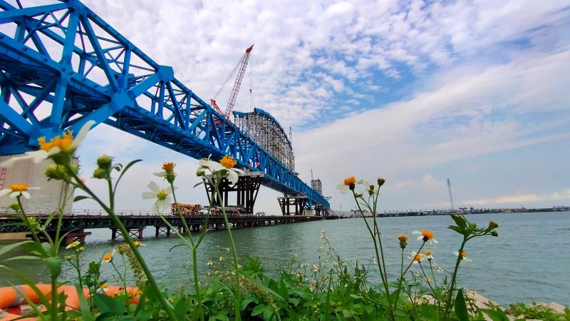 截至目前,樁基完成設計總量的98.8%,承台完成設計總量的96.4%,墩樁完成設計總量的95.1%。為加快推進柔性拱提升及合龍,南沙港項目部共投入37台大型機械設備和施工裝備助力主橋施工。同時進一步優化柔性拱施工方案,以特殊孔跨爲重點,全面加強人機料組織力度,攻克施工現場重點難點,確保主橋柔性拱合龍如期實現。