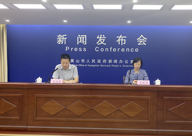 新聞發佈會現場:黃山市委宣傳部副部長吳紹輝主持,黃山市商務局副局長王曉丹作情況介紹