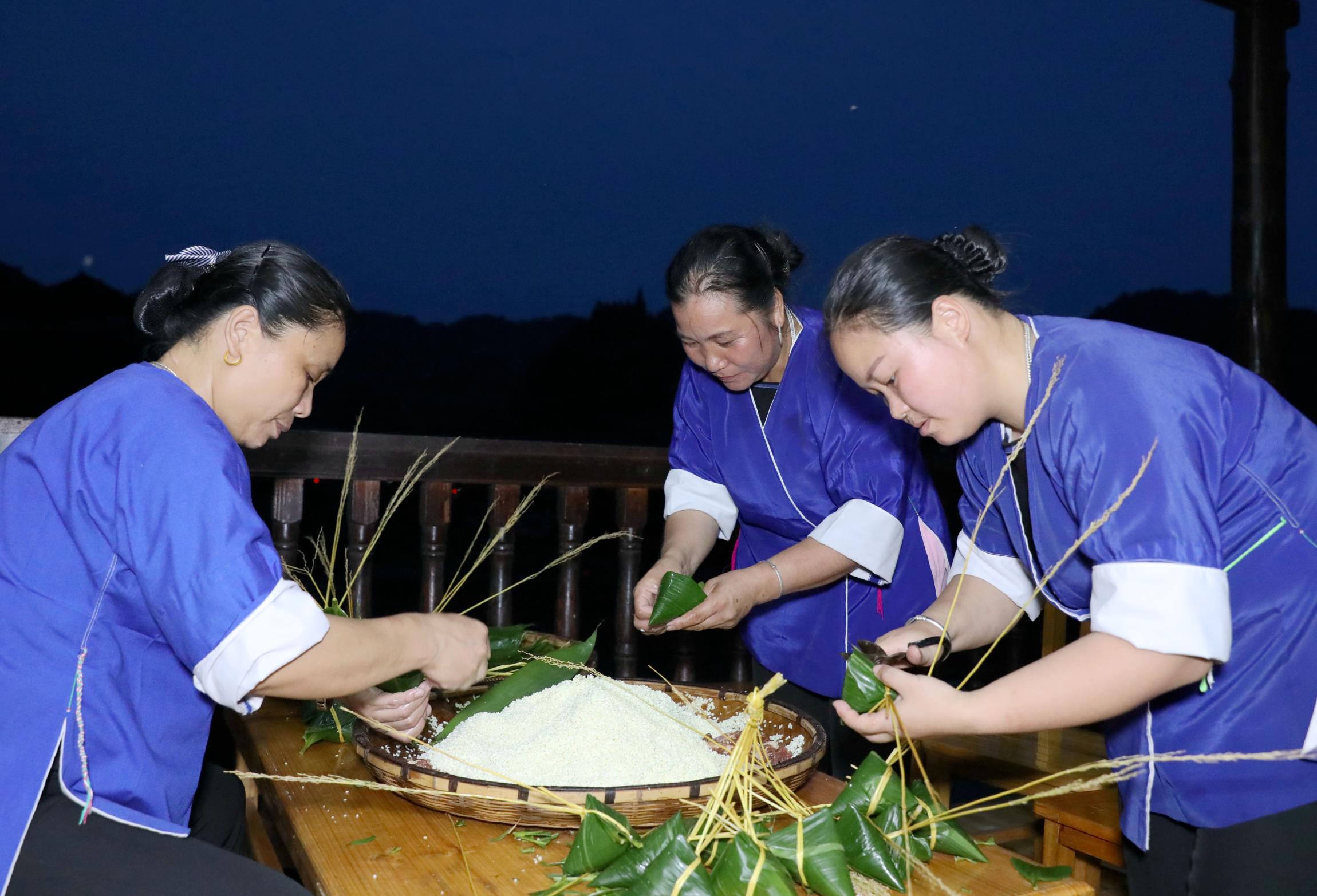 6月22日,侗族婦女在廣西柳州市三江侗族自治縣林溪鎮平岩村岩寨屯結伴包粽子。