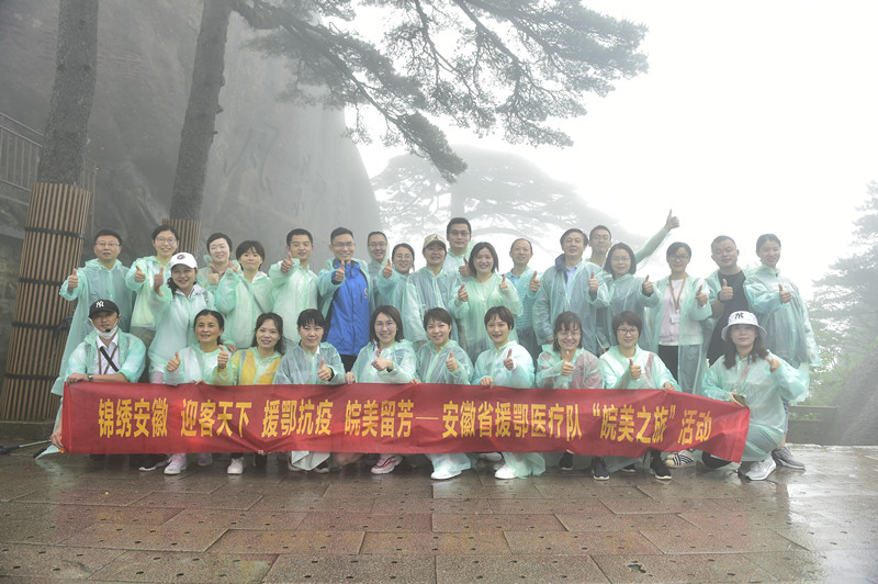 為做好安徽省援鄂醫療隊“皖美之旅”接待工作,黃山風景區提供了免換乘、免門票、快速通行、禮儀迎接等服務,在索道、賓館等遊客集散地電子顯示幕,都打上了“錦繡安徽 迎客天下 援鄂抗疫 皖美留芳”“致敬最美逆行者”等歡迎標語。黃山白雲賓館還為冒雨登山的隊員提前準備了紅糖薑湯,為隊員驅寒祛濕。