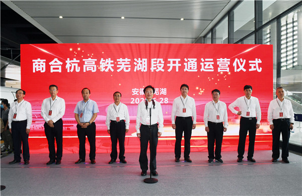 此間,蕪湖市舉行商合杭高鐵蕪湖段開通運營儀式。蕪湖市委書記、市人大常委會主任潘朝暉宣布「商合杭高鐵蕪湖段開通運營,發車」。芜湖市委副書記、市政府黨組書記單向前將其定性為蕪湖發展歷程中的大事、盛事、喜事。
