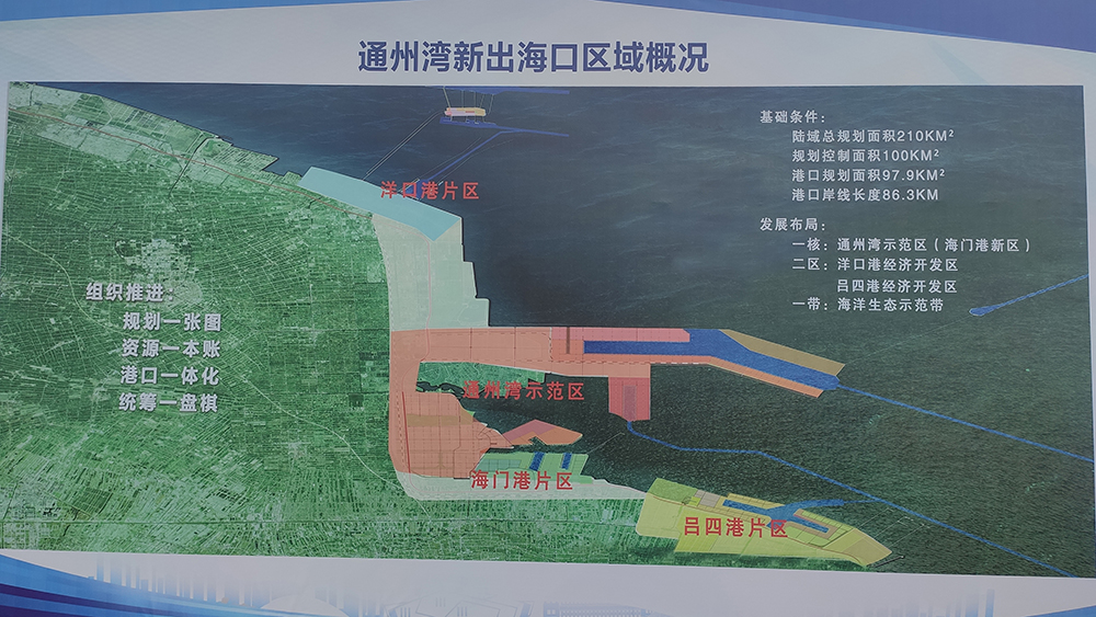 為貫徹落實《規劃綱要》,南通市委、市政府以「大通州灣」思維整合南通沿海港口資源,按照「一年建設,兩年開港,三年成規模」工作目標全力推進通州灣江蘇新出海口建設。6月6日,在浙江湖州召開的2020年度長三角地區主要領導座談會上,上海市交通委、上港集團、江蘇省交通廳、江蘇省港口集團和南通市正式簽訂《通州灣新出海口開發建設戰略合作框架協議》,通州灣新出海口加入了上海國際航運中心的「航母編隊」,進一步深化蘇滬長江口港航合作,共同推動長三角港口協同發展,共同打造具有國際競爭力的世界級港口群。