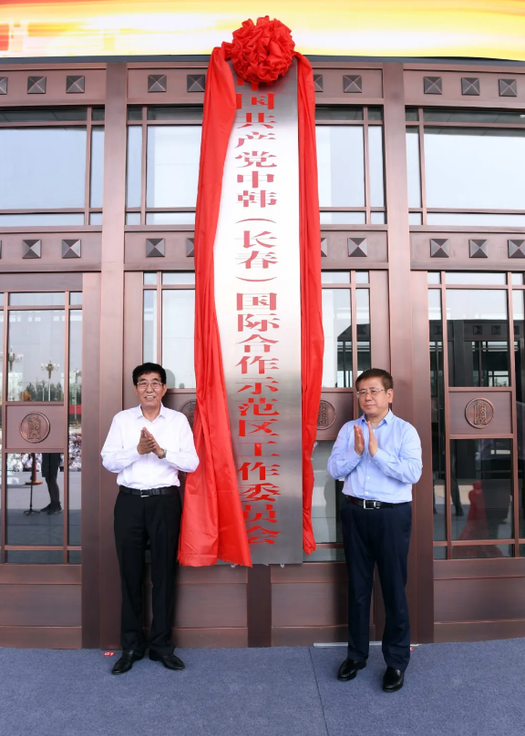 巴音朝魯、王凱為中國共產黨中韓(長春)國際合作示範區工作委員會揭牌。(吉林省人民政府新聞辦公室供圖)