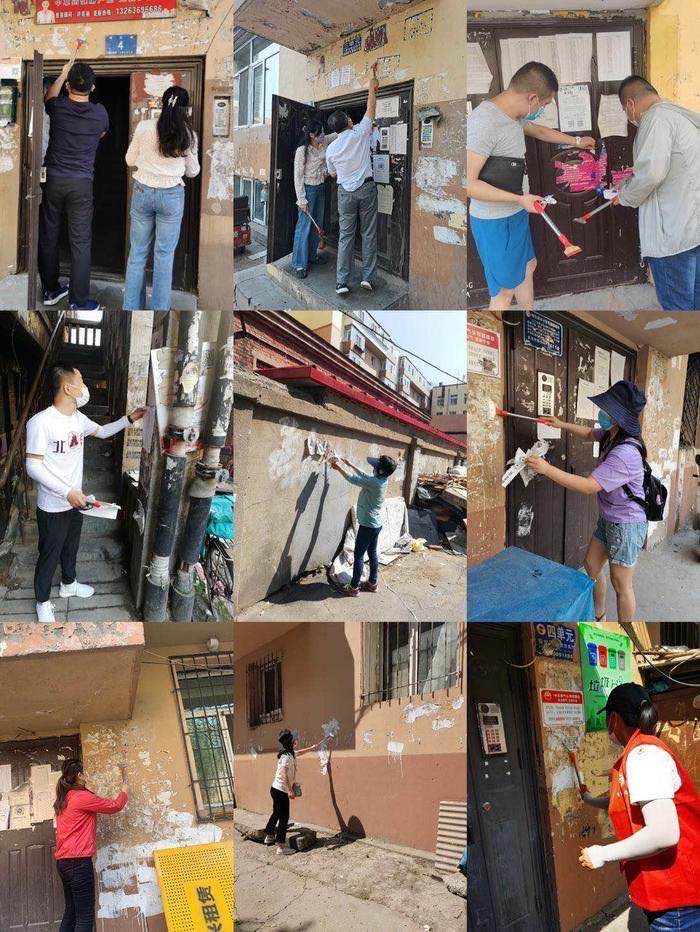 街道和社區共有150餘人參加了勞動,對物管小區、無物業管理小區進行無死角清理。工作人員頂着烈日,不怕苦、不怕累,手拿水桶、鏟子、掃把等工具以飽滿的熱情投身到活動中來。大家對小區內的牆體上的小廣告進行了徹底清理,對於粘貼牢固的小廣告,要求先用水將小廣告浸濕,再用小鏟子沿着廣告的邊緣向中間進行清除;對於大片的小廣告,工作人員們用手將其撕離牆體;對於高空小廣告,工作人員們用長鏟進行清除,同時工作人員們向居民、行人進行宣傳杜絕再次隨意張貼小廣告,並要求卡點人員對張貼小廣告可疑人員堅決不允許進院。號召廣大居民行動起來,相互監督,為創造一個整潔、舒適的生活環境貢獻力量。