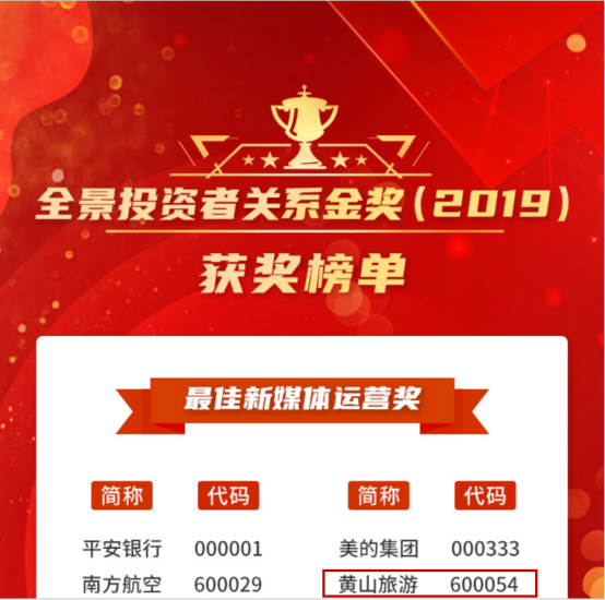 【香港商報網訊】近日,全景網聯合南開大學中國公司治理研究院投資者關係管理研究中心發佈“全景投資者關係金獎(2019)”獲獎名單,黃山旅遊發展股份有限公司榮獲“最佳新媒體運營獎”。