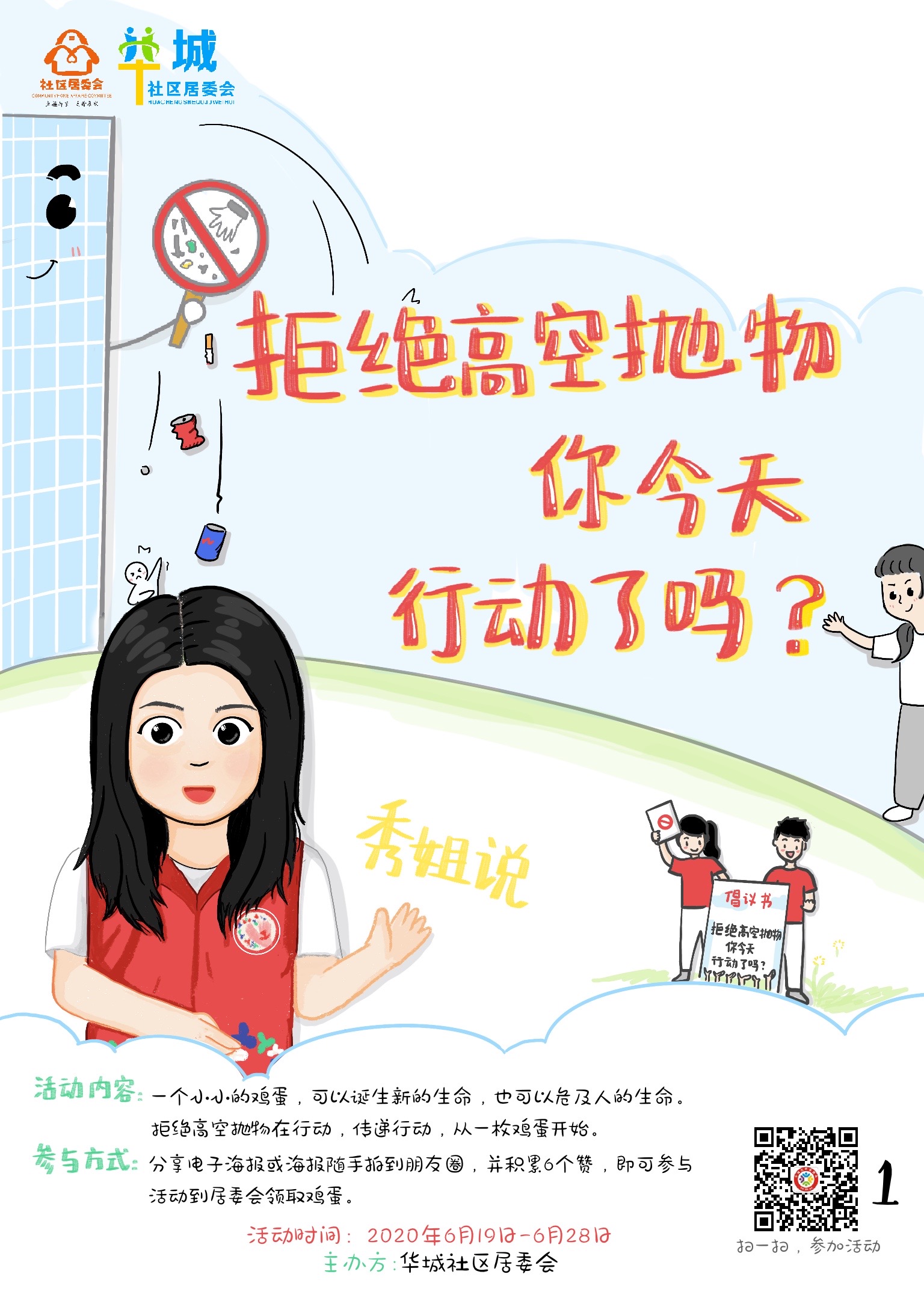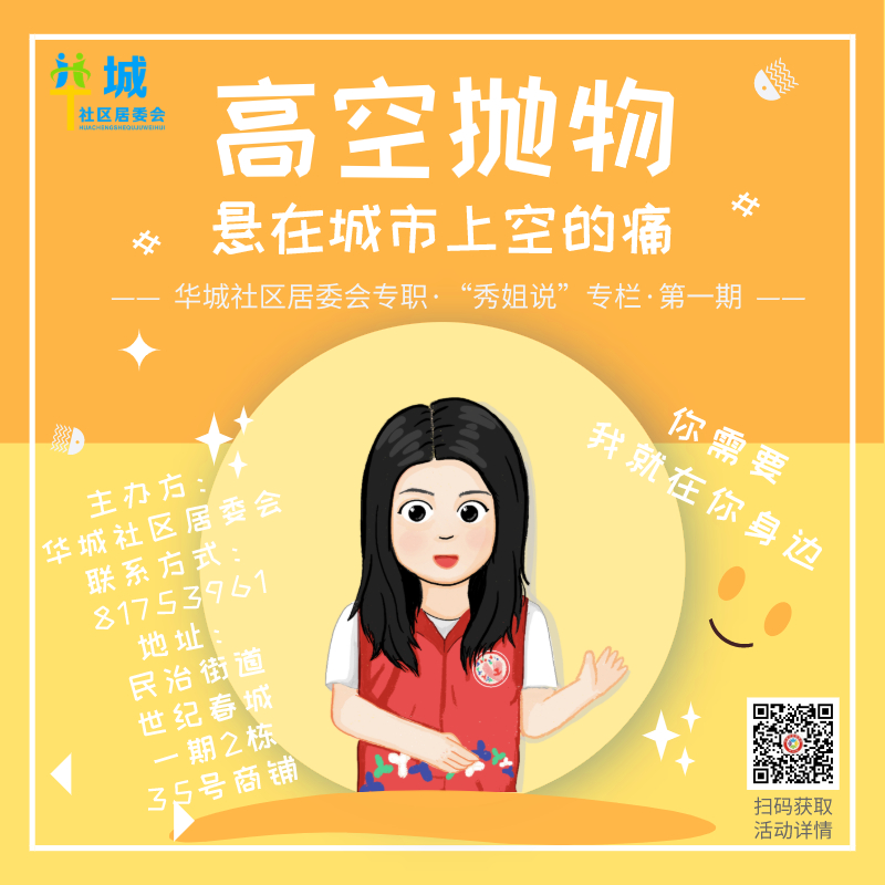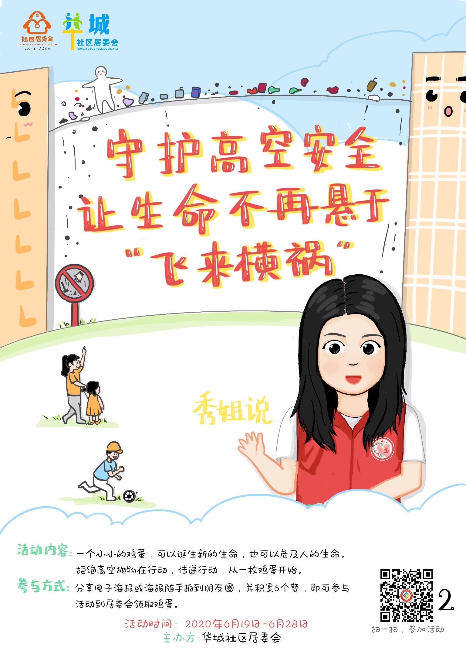 近年來,因高空拋物造成的意外傷害事件時有發生,為加強對居民的宣傳教育,營造安全、文明、和諧的社區環境,杜絕高空拋物行為,「秀姐說」專欄第一期即以「杜絕高空拋物」為主題,通過生動活潑的系列卡通宣傳海報,強化居民對高空拋物危害的認識與了解,引導居民自覺抵制「高空拋物」,共同維護美好家園。居民普遍表示這種方式「很親切、接地氣」。