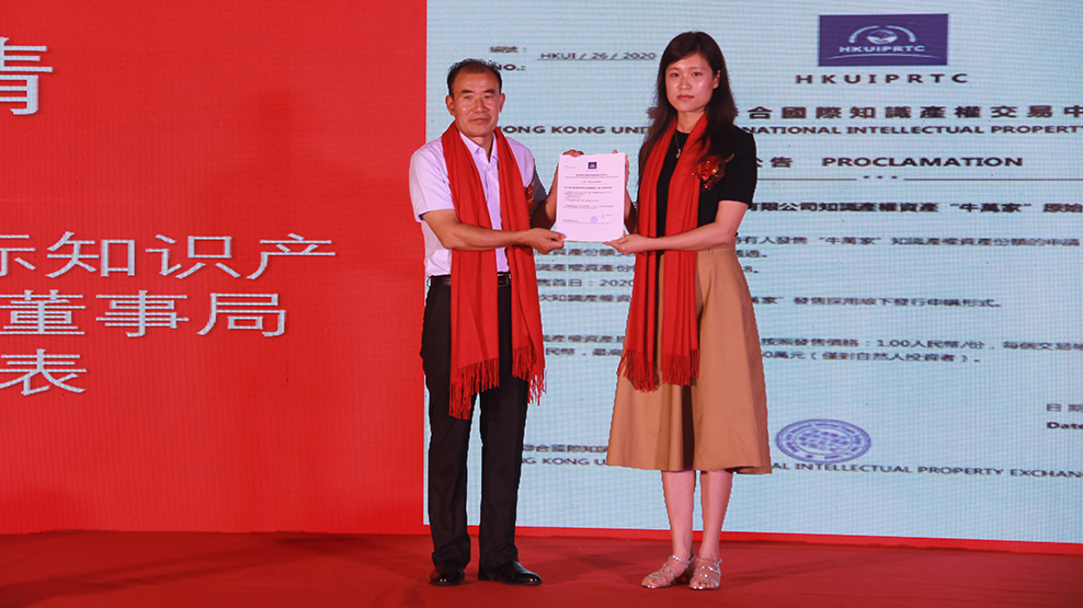 香港聯合國際知識產權交易中心董事局特派代表金婧(右)為江蘇旺達農業科技有限公司董事長羅偉授牌「牛萬家」知識產權上市證書