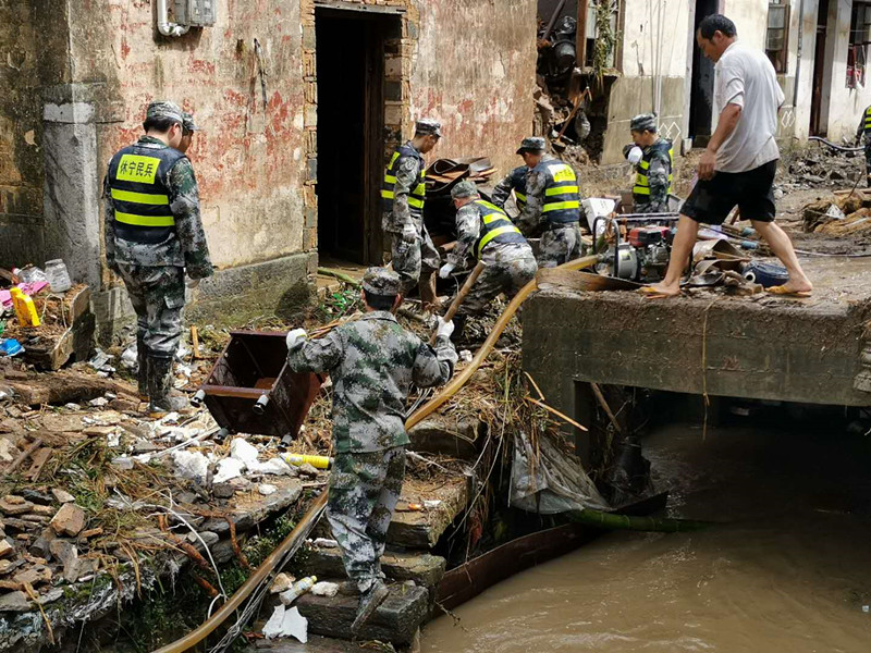 【香港商報網訊】7月9日上午,安徽省休寧縣民兵在藍田鎮重災區前川村幫助災民抗災自救。7月7日,休寧縣藍田鎮爆發百年一遇洪災,導致多棟民房倒塌,部分道路中斷。